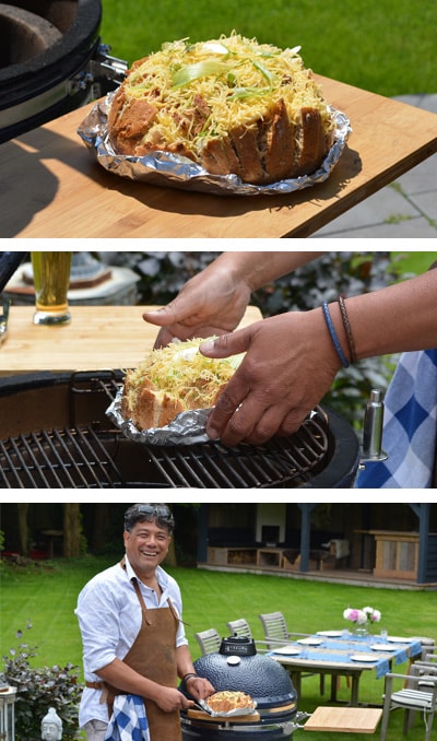 - Snij het brood in een ruitpatroon in om de 5 cm en leg deze bol op zilverfolie