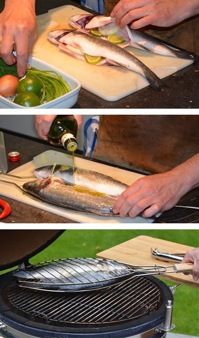 - Bestrooi de holte van de vis met zout en peper en snijd het vlees aan beide kanten een paar keer in. Vul de holte met dunne schijfjes limoen, ui en dille, bestrijk de vis met olijfolie en leg de zeebaarzen in de visklem. Als de visklem niet op je Takumi keramische BBQ past, kun je de zeebaars ook met keukengaren opbinden.